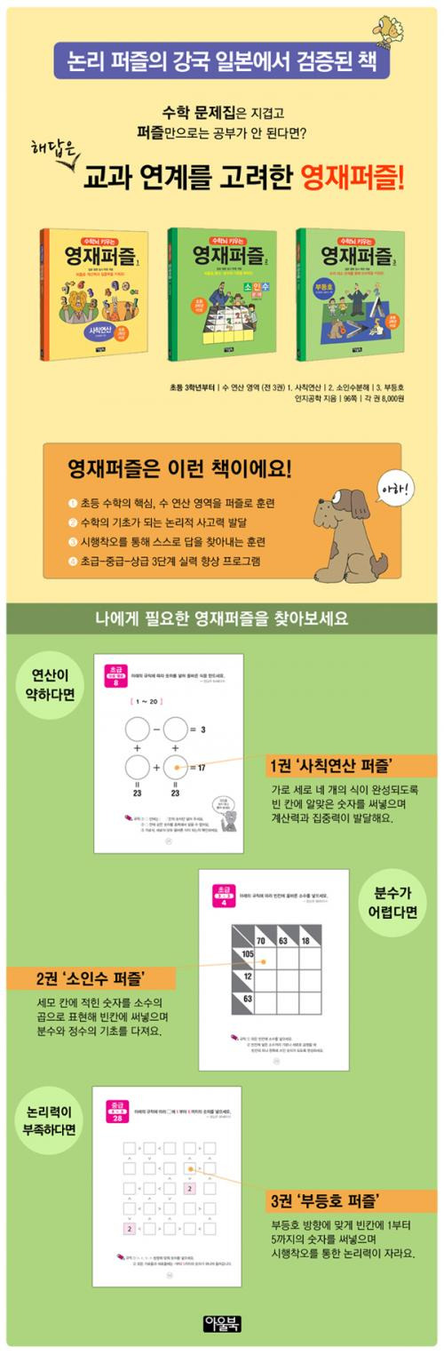 사칙연산은 초등학교 1학년 1학기부터 배우는 수학의 기초이다. 저학년의 경우 수 연산 영역이 수학 교과의 절반 이상을 차지하며, 학년이 올라갈수록 수학이 어려워지는 이유 역시 연산 능력의 부족인 경우가 많다. 수학은 연계성이 강한 학문이기에 기초적인 연산 훈련이 뒷받침되지 않으면 중학교 수학으로 연계도 불가능하다. 이렇듯 피할 수 없는 연산 훈련을 지루하지 않게 효율적으로 할 방법은 없을까? 일본의 입시 명문 학원 ‘인지공학’이 개발한 수학뇌 키우는 영재퍼즐 은 이러한 의문에 대한 답으로 ‘사칙연산 퍼즐’을 제안한다. 이 책은 단 하나의 퍼즐 유형으로 구성되어 있으며, 책에 수록된 66개의 퍼즐을 다 풀고 나며 사칙연산의 원리를 자연스럽게 터득하게 된다.